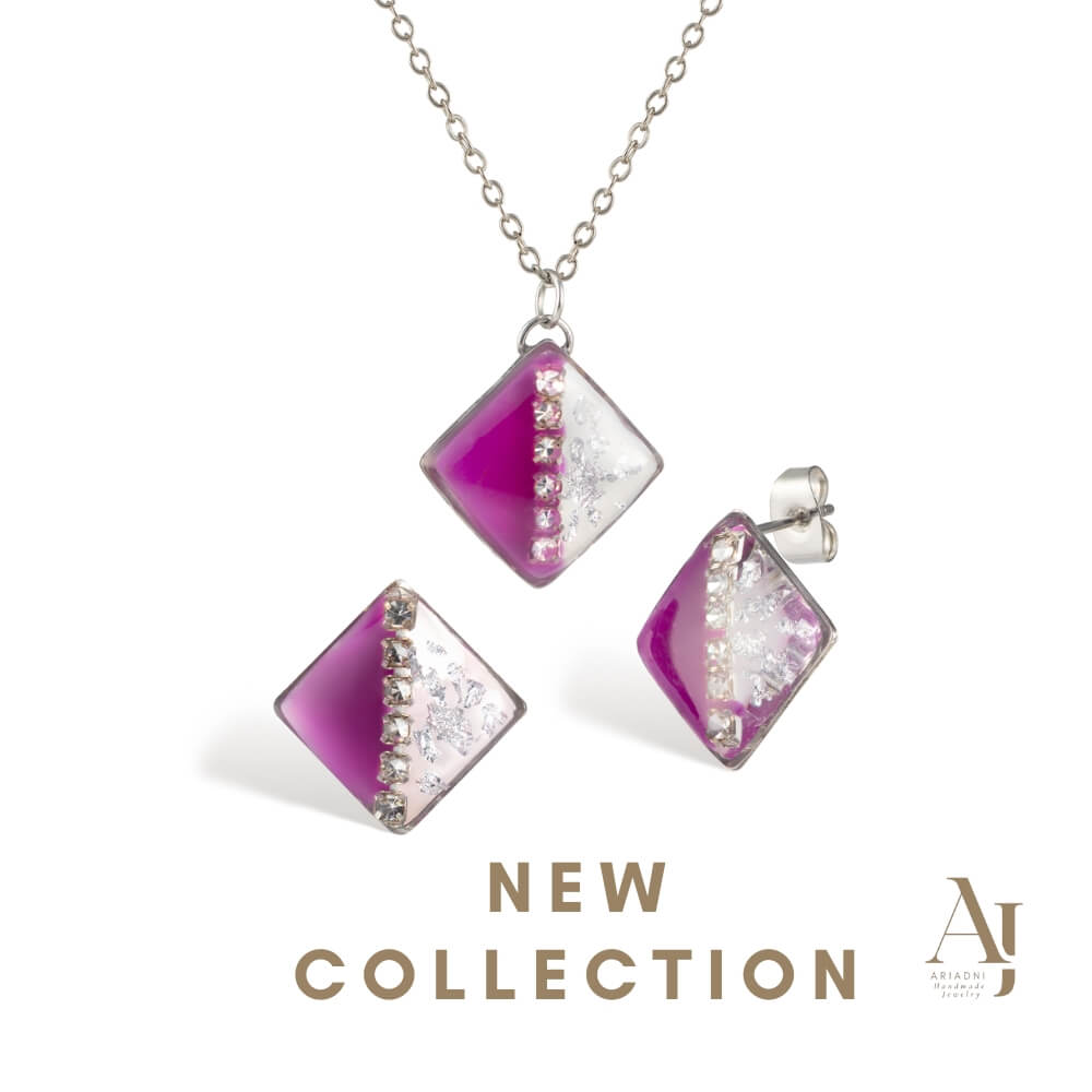 Σετ με μενταγιόν και σκουλαρίκια από ρητίνη, σε αποχρώσεις του μωβ και του διάφανου, διακοσμημένα με στρασάκια και λεπτομέρειες glitter. Ατσάλινη αλυσίδα και βάση.